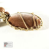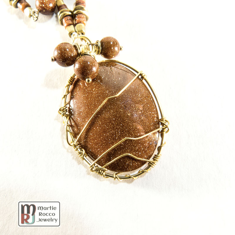 Sparkly Brown Goldstones are hand wrapped with brass wire. Large Goldstone cabochon is the focal piece and is also wrapped with brass wire.